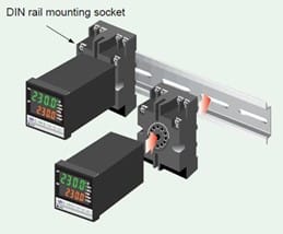 OP10 16th DIN compact setting display unit with an optional DIN rail mounting socket.